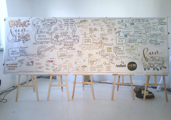 Zobacz kilka zdjęć, które ilustrują (sic!) moją pracę i jej efekty. Wielkoformatowe, rysowane plakaty to przede wszystkim wsparcie dla procesu uczenia się, rozumienia i zapamiętywania. To także dodatkowa atrakcja dla uczestników spotkań, warsztatów czy konferencji. Powstają na żywo, a kiedy są już gotowe, ludzie robią sobie przy nich pamiątkowe zdjęcia i dzielą się nimi ze znajomymi.